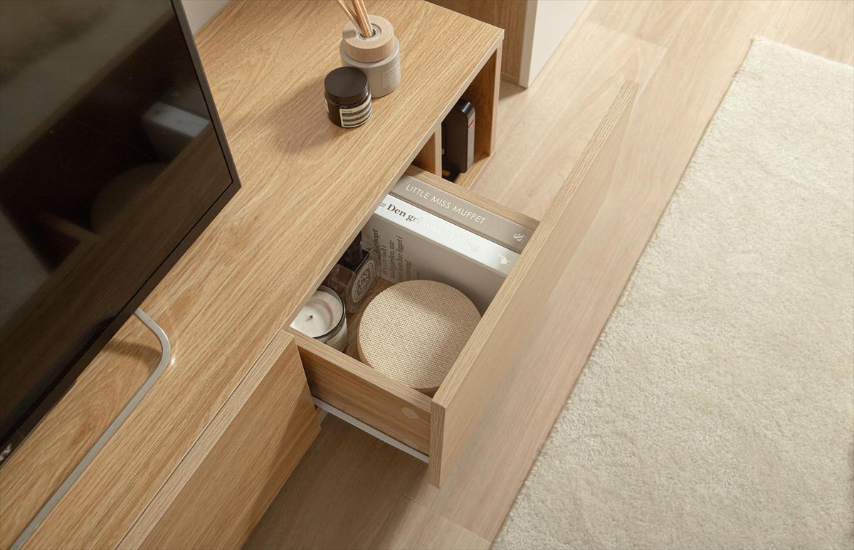 引き出し付きの設計により、リモコンや雑誌などの小物を整理整頓できるのが魅力です。引き出しはスムーズに開閉でき、使いやすさを追求しています。シンプルでありながら高級感のあるデザインは、ナチュラルな雰囲気やモダンな空間にも合わせやすく、お部屋の雰囲気を格上げします。