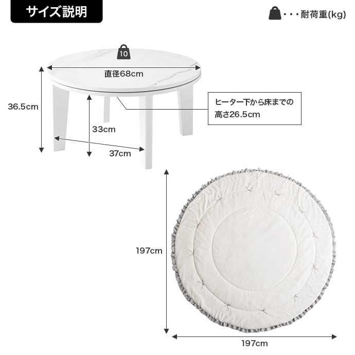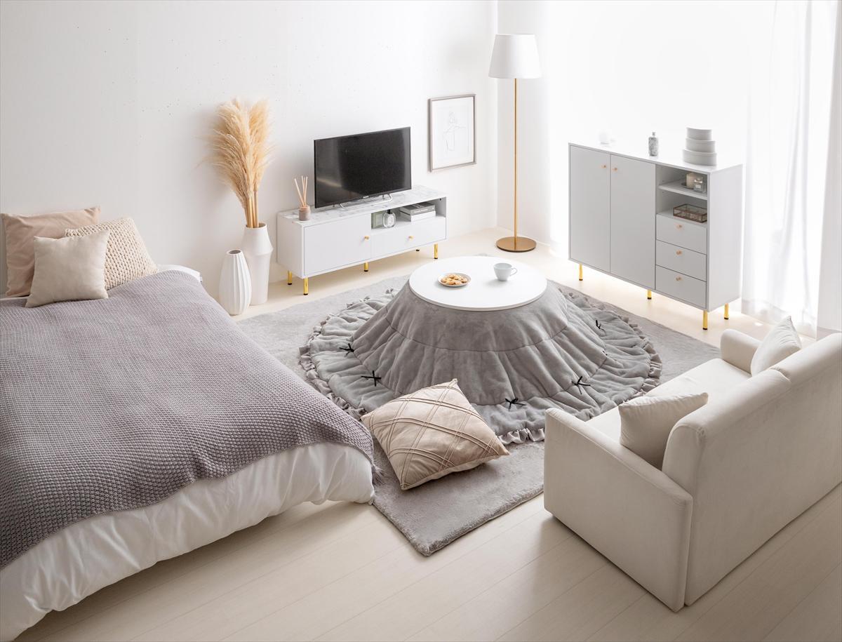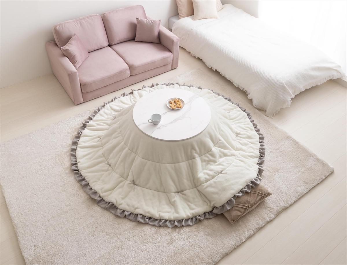 暖かさと可愛らしさを兼ね備えた【円形:天板 68cm】こたつ&リボン・フリル付き掛け布団2点セット!円形のこたつは、リビングやダイニングでの家族や友人との交流をより温かいものにし、居心地の良い空間を提供します!