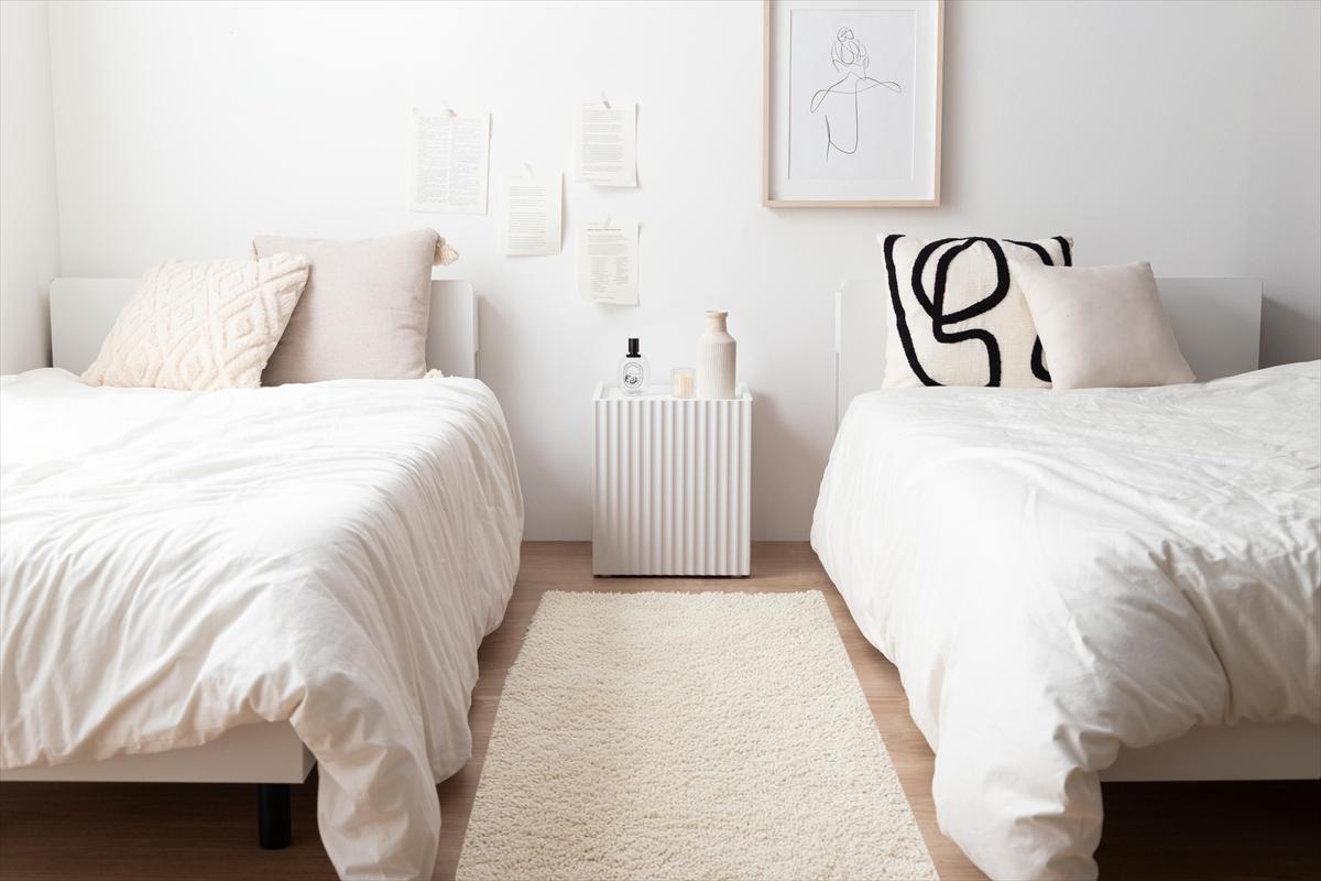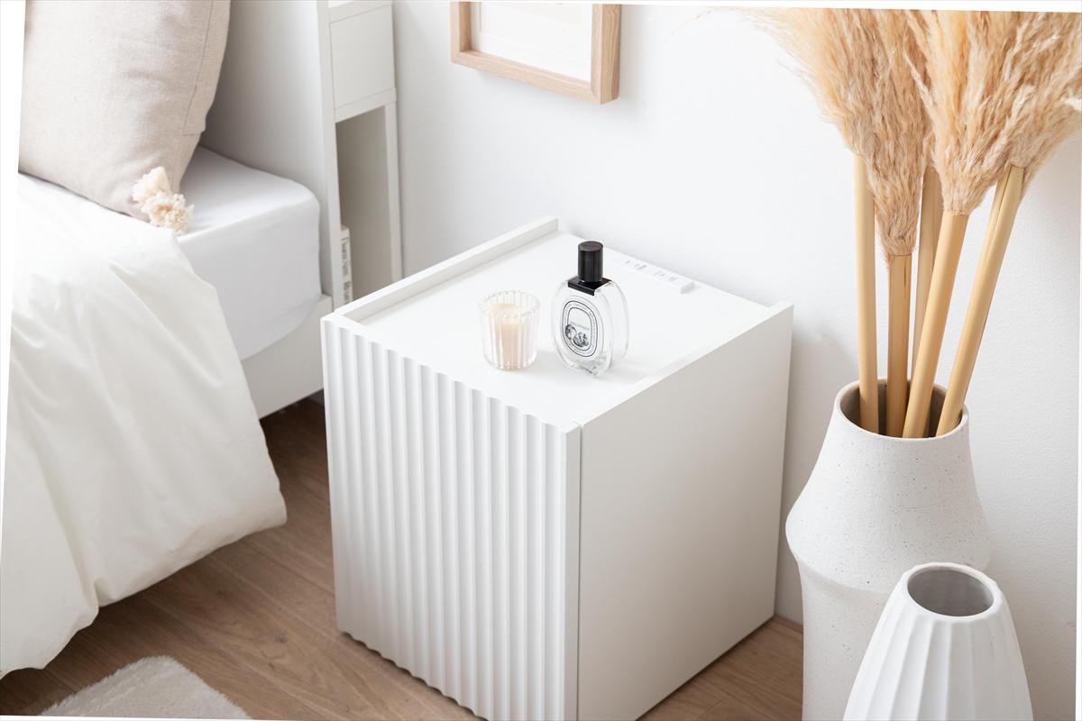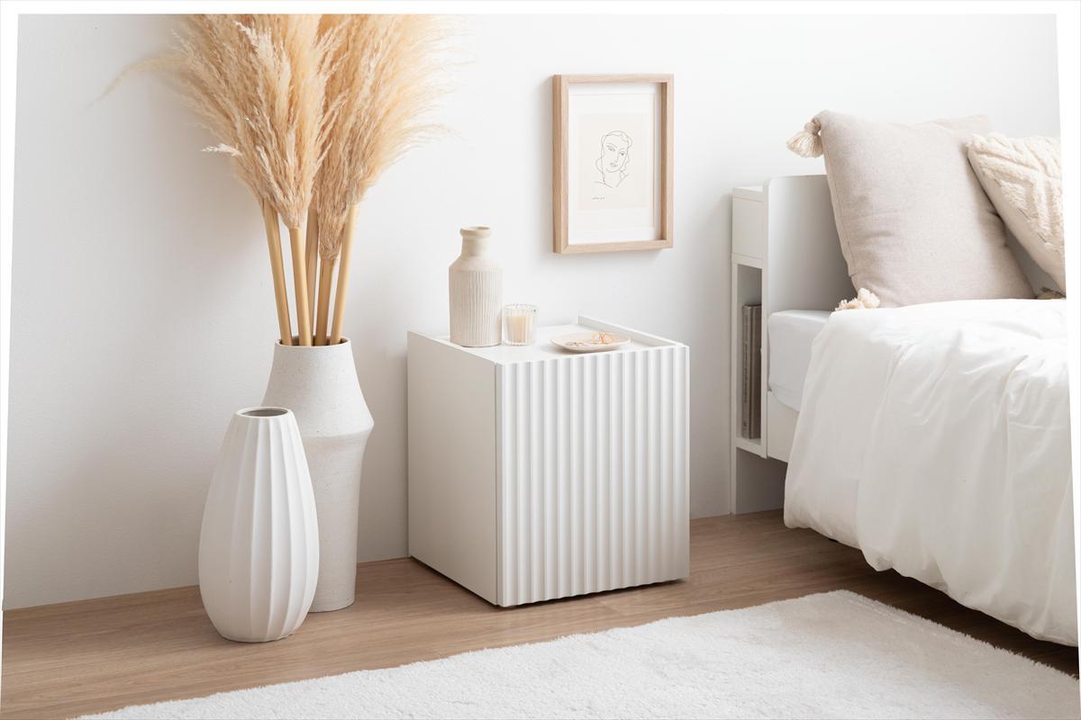 ホワイトで仕上げられたサイドテーブルは、波型扉のデザインが特徴的。洗練されたスタイルを演出します!