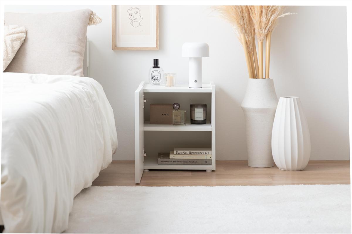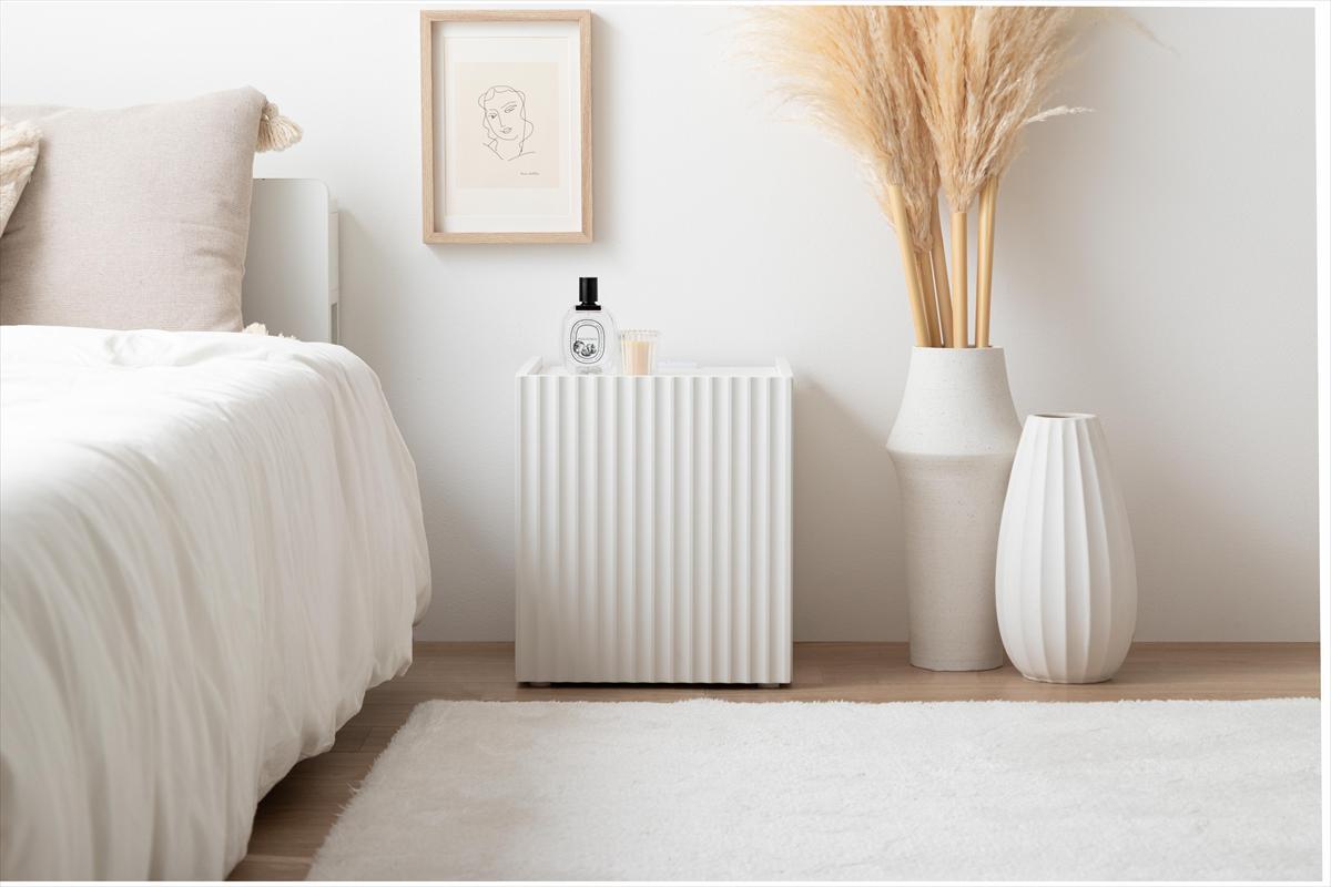 清潔感のあるホワイトと波型扉が魅せる幅35cmの小型キャビネット型サイドテーブル。