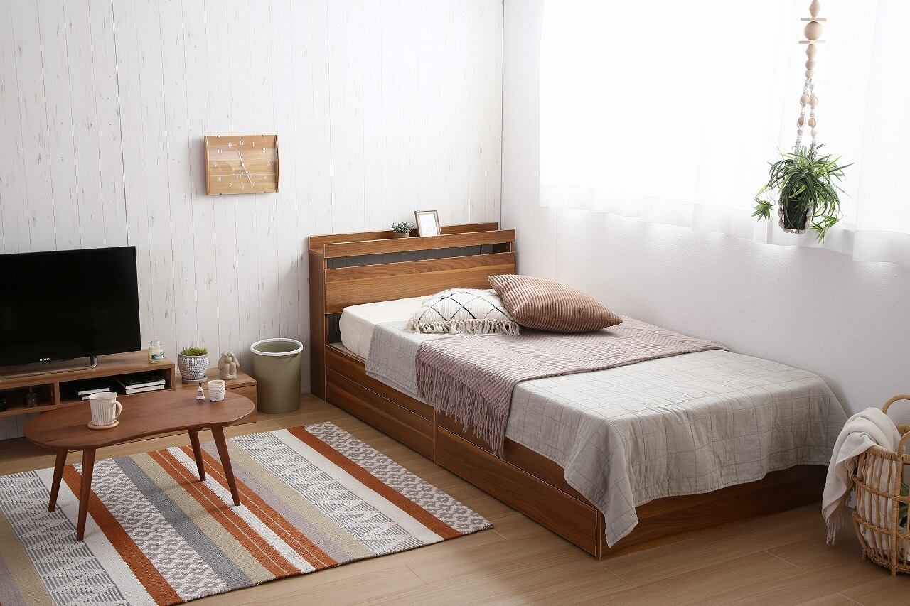 シンプルですっきりとした見た目のベッドフレーム。ベッド下には衣類などをたっぷり収納できる2杯の引き出し収納を付けました。ベッドの設置スペースに収納スペースも確保し、お部屋をすっきり整理していただけます。ヘッドボードには、読みかけの本や目覚まし時計を置くことができるので、就寝・起床時も快適です!