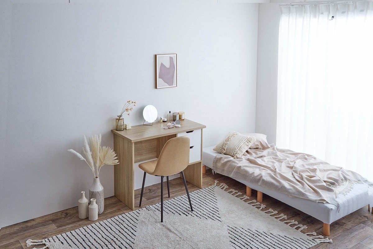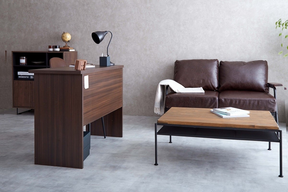 圧迫感のないコンパクトさが自慢のデスクですが、幅は100cmあるので使いやすさもしっかり兼ね揃えています。PCなど大きさのある物を置いたり書類を広げても空きスペースはまだ確保できるので、ワークスペースとして大活躍。デスクライトやインテリア雑貨を置いておしゃれで快適なデスク環境もお作りいただけます。