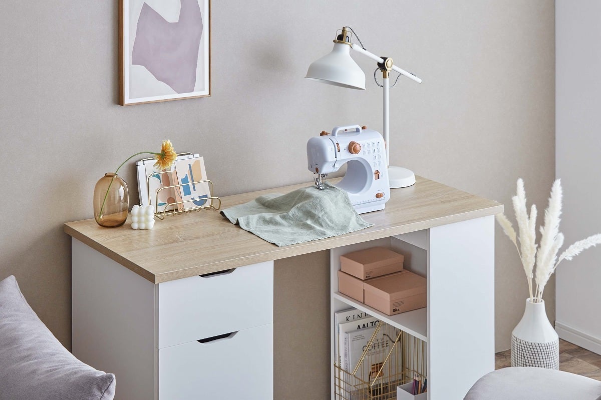 引き出し・開き扉収納・棚の3種類の収納スペースを備えた実用性の高い収納付きデスク