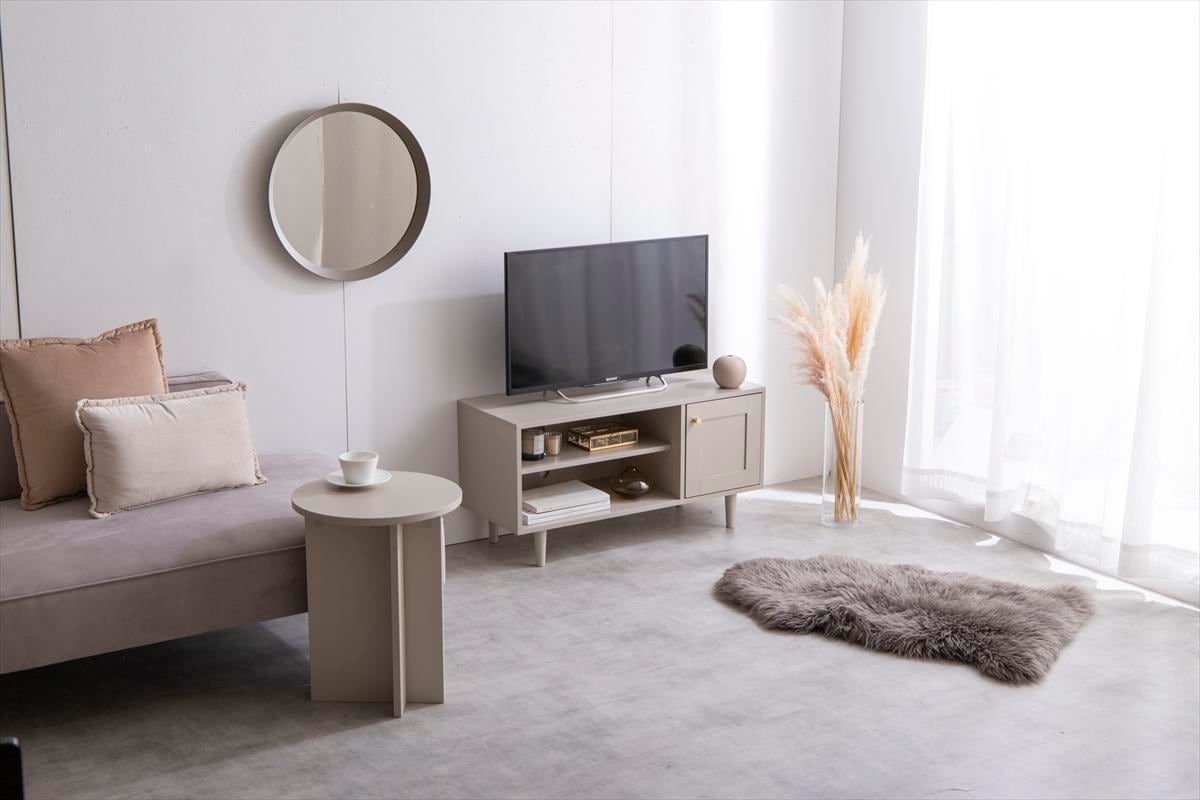 框(かまち)と呼ばれる枠材で枠組みをした引き出しと柔らかなニュアンスカラーが、甘すぎず落ち着いた印象を与えるテレビボードです。