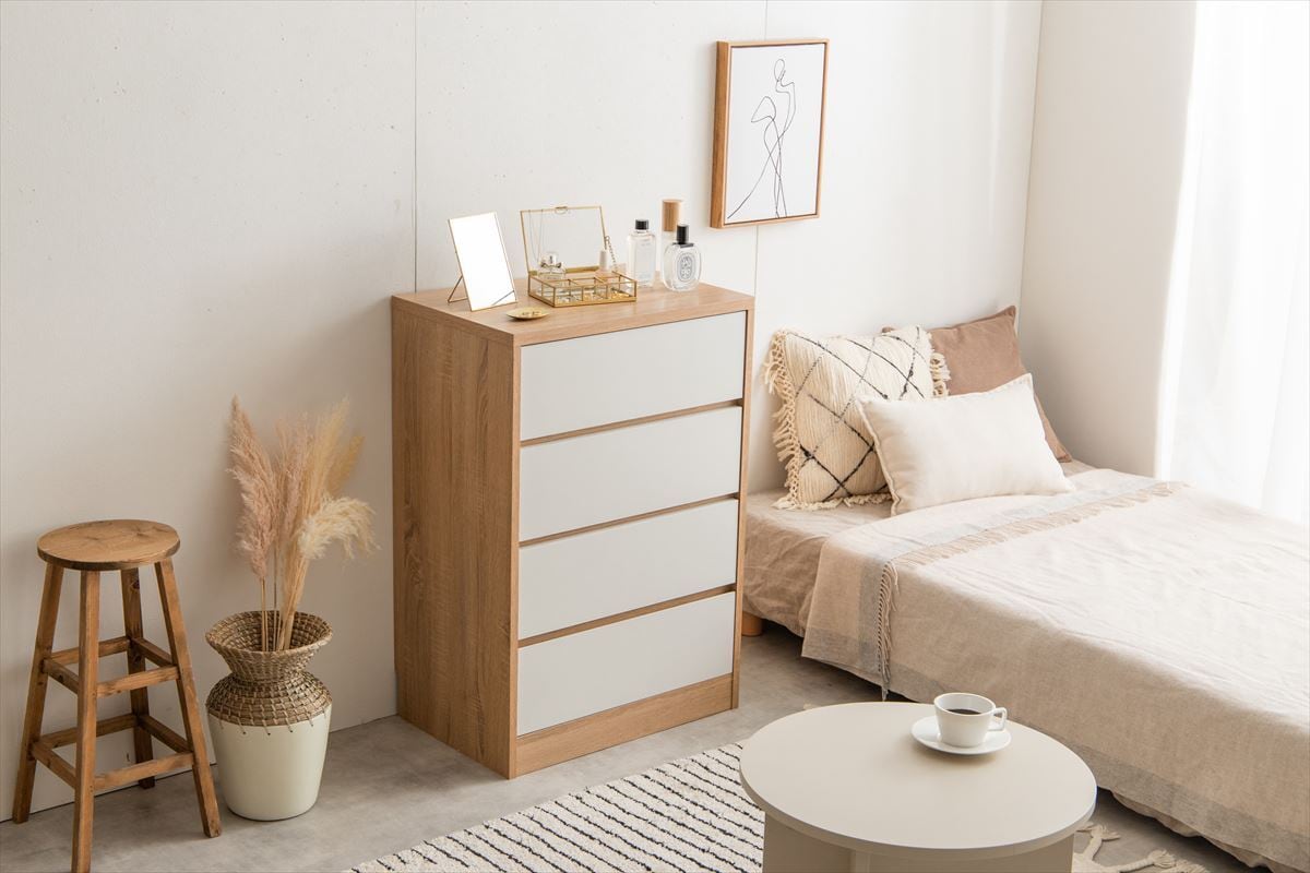 落ち着いた大人の雰囲気漂うチェスト。ノイズレスでシンプルなデザインは、お部屋にスッと馴染み、スタイリッシュな空間を演出します。また、4段の引き出しでたっぷり収納が可能。さらに、コンパクト設計なのでワンルームや一人暮らしの方にもおすすめです。