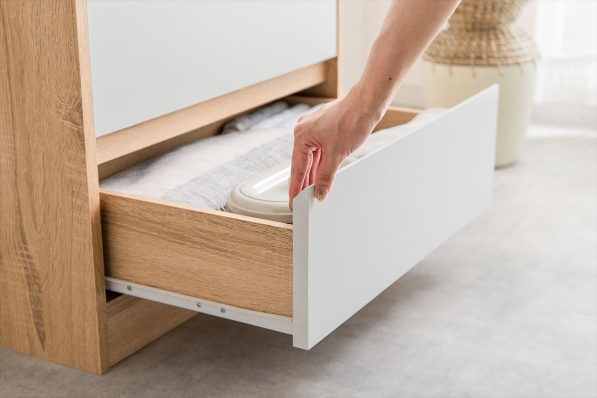 無駄なものを削ぎ落したノイズレスのチェストは、お部屋に溶け込み、すっきりした印象を与えます。また、引き出しの取っ手部分には、掴みやすいよう斜めカットを施しました。シンプルに仕上げつつ使用感にもこだわった使いやすいチェストです。
