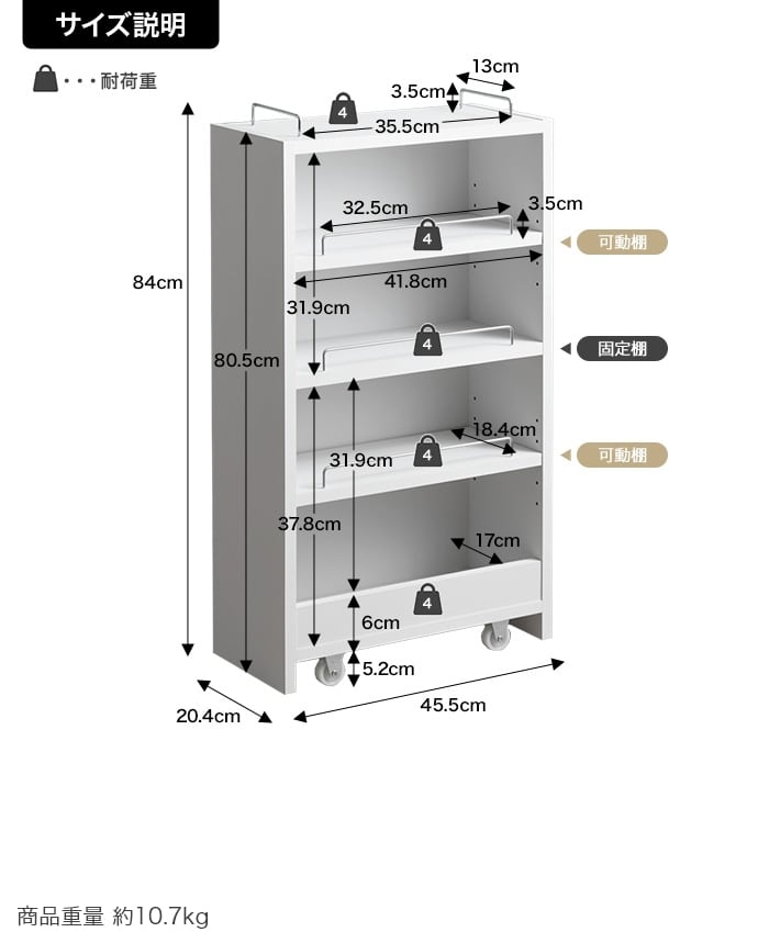 各棚板と天板には、収納した物の落下を防ぐストッパーが付いています。 また、底板は深さのあるボックス型になっているので、ペットボトルや洗剤などのストックにもピッタリです。