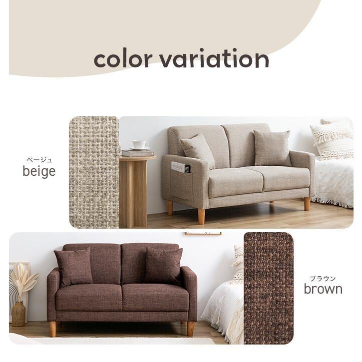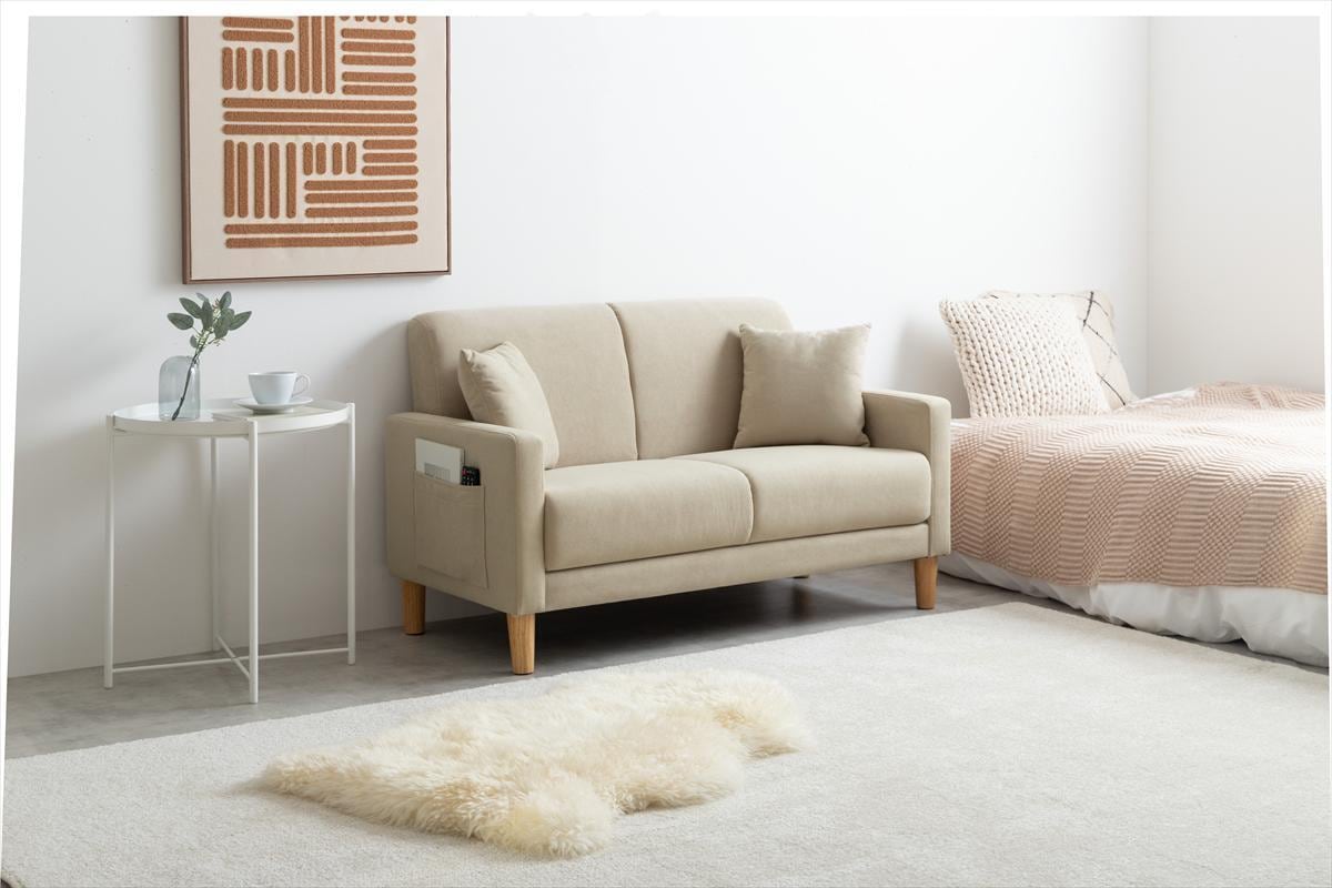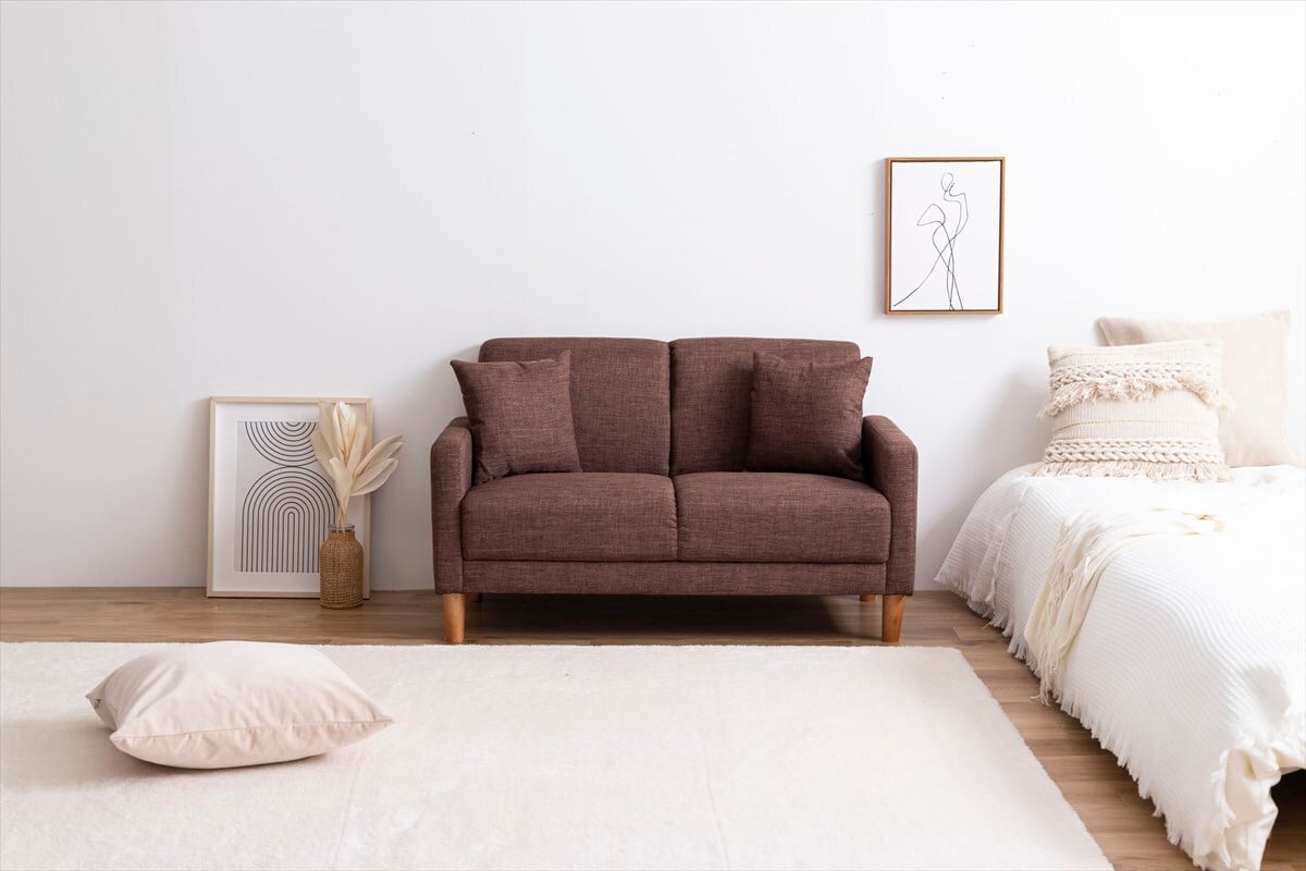 ファブリックと天然木の組み合わせが温かみのある印象を与える2人掛けコンパクトソファ。