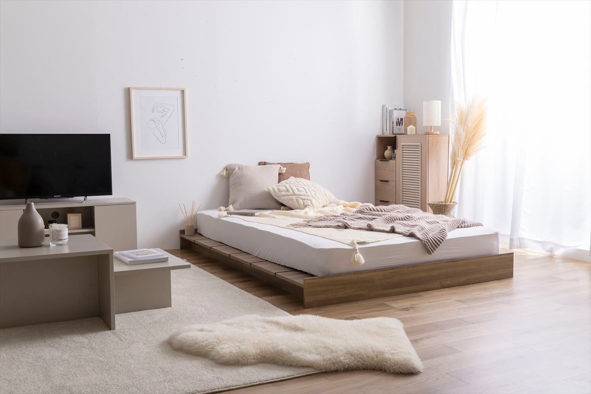 マットレスのサイドスペースに小物なども置ける、和モダンでおしゃれな幅広設計のすのこローベッド。
