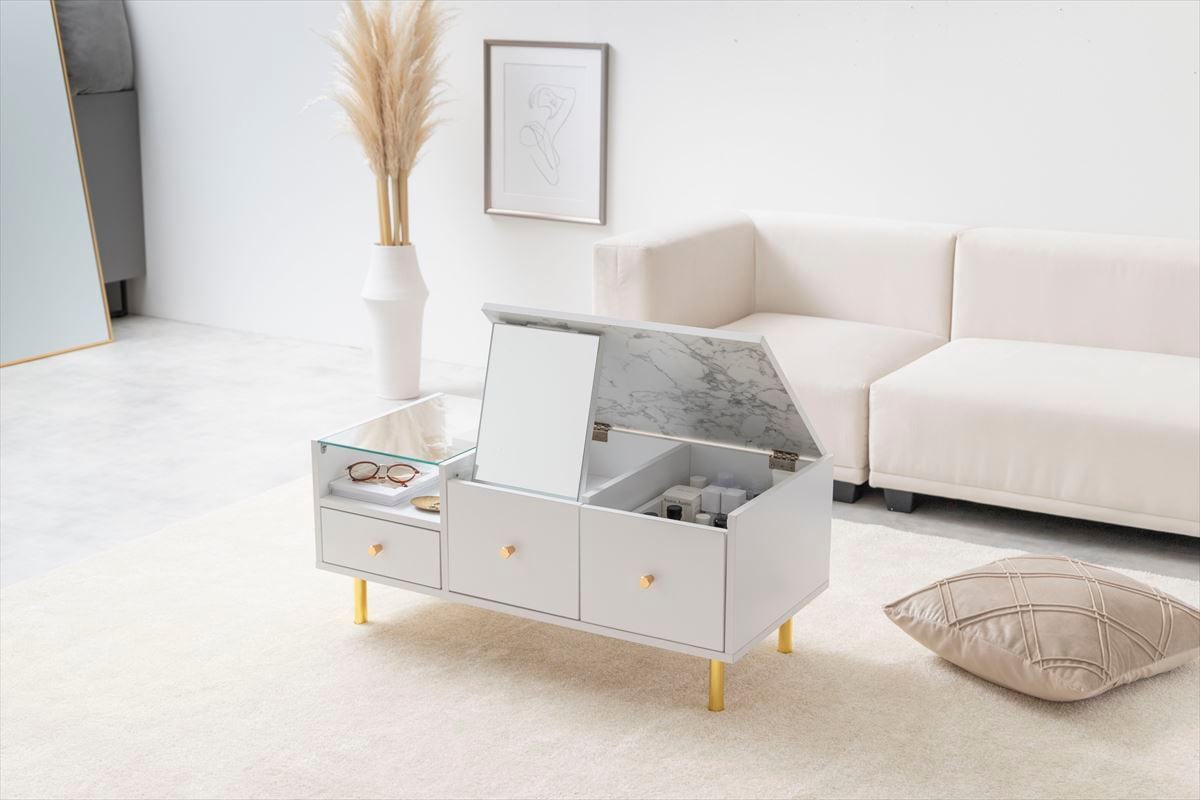 大理石柄の天板とゴールドのあしらいが大人かわいいドレッサーテーブル。普段はセンターテーブル、メイク時は天板を開けるだけでドレッサーへと早変わり。コンパクトながら3杯の引き出し付きで、ごちゃつきがちなメイク用品もまとめて収納できます。