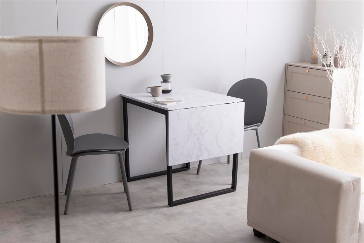 天板を折りたたむと幅70cm×奥行70cmに、広げると幅110cm×奥行70cmと、1台で2つのサイズを使い分けることが可能です。ダイニングテーブルとしてはもちろん、カフェテーブルや作業用デスクとしてもシーンに合わせて大活躍します。