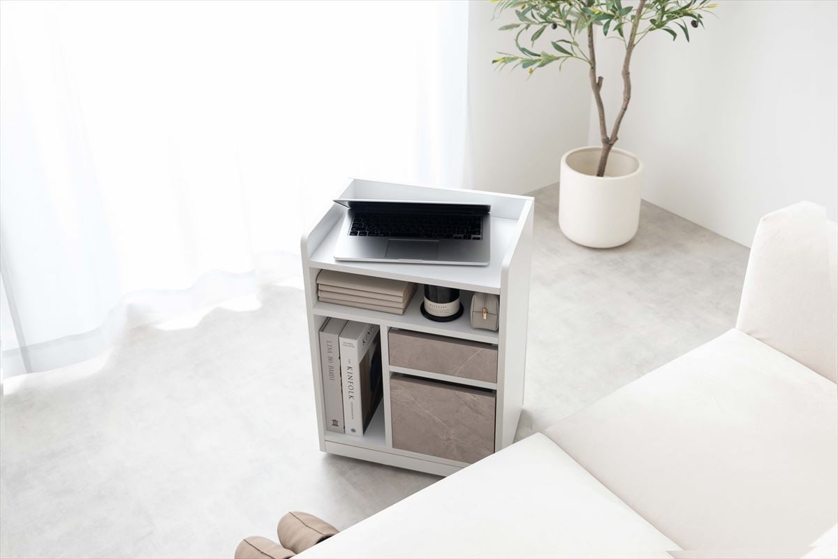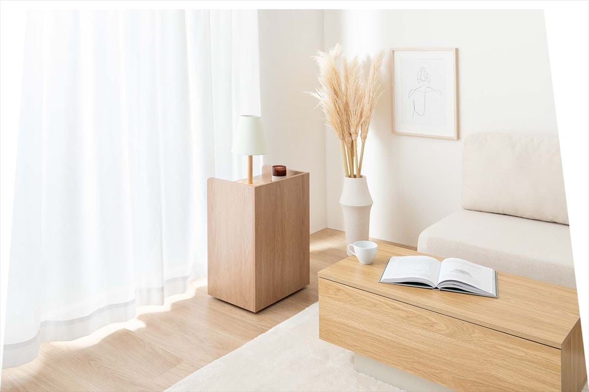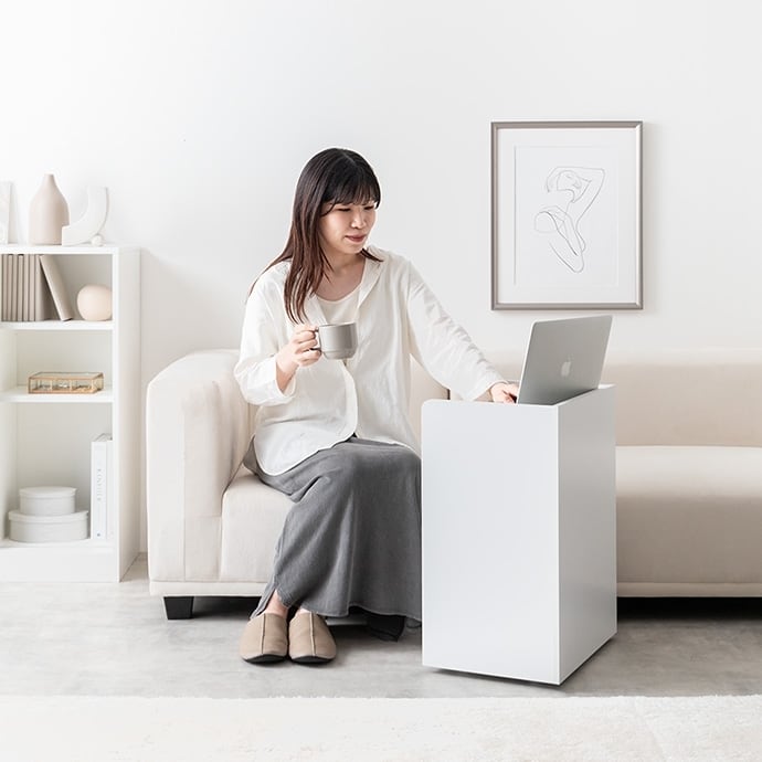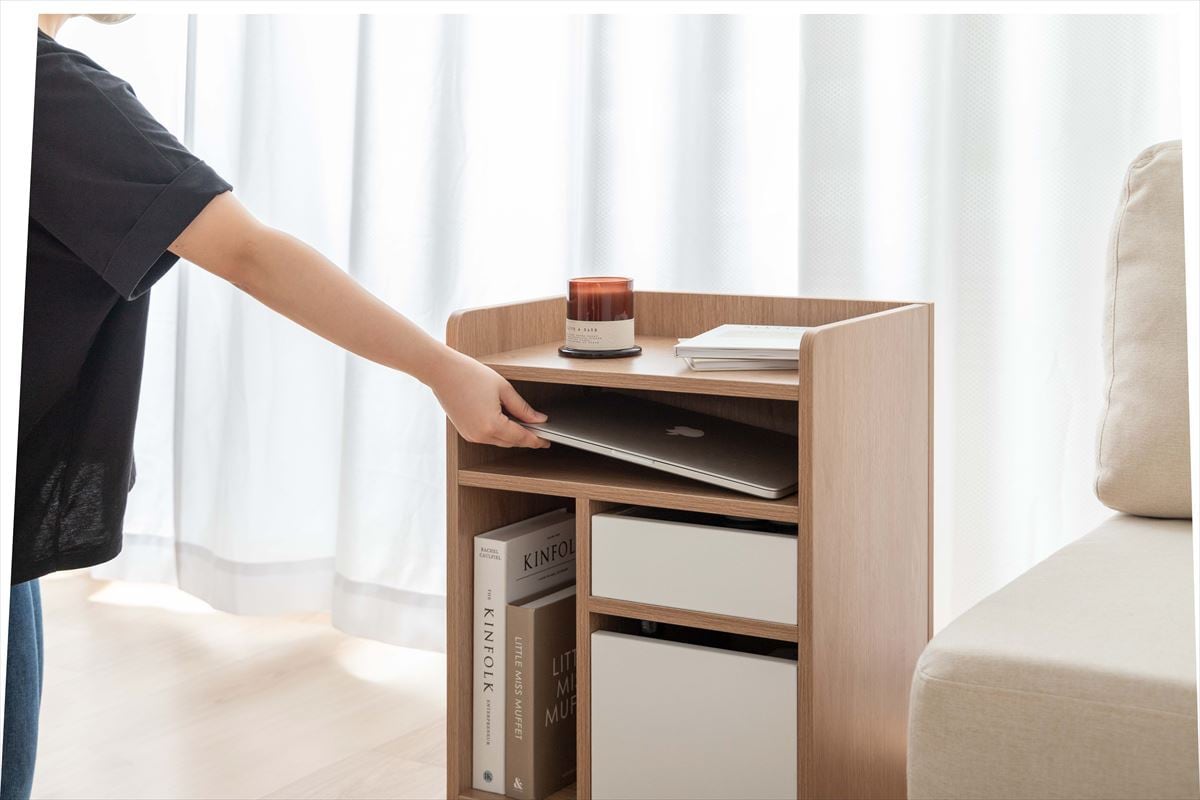 背面側にくるりと回すだけで、収納物が見えなくなり、まるでオブジェのようなサイドテーブルに。ノイズレスな見た目になるので、生活感を抑えたすっきりした空間にすることができます。急な来客時などでもサッと対応できるので、すぐに目隠ししたい時にも便利です。