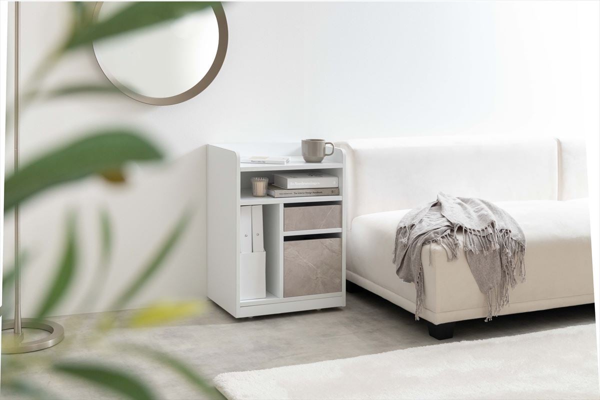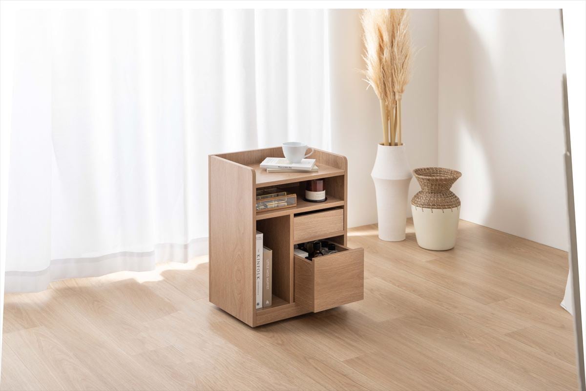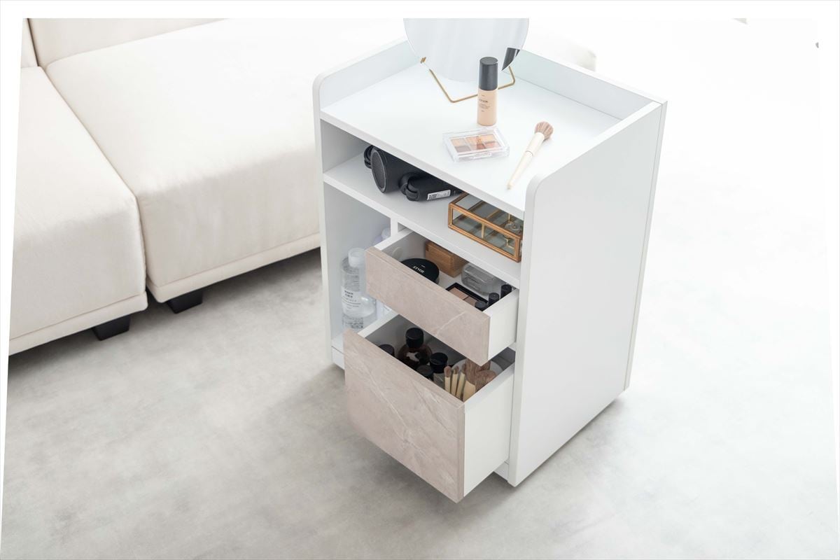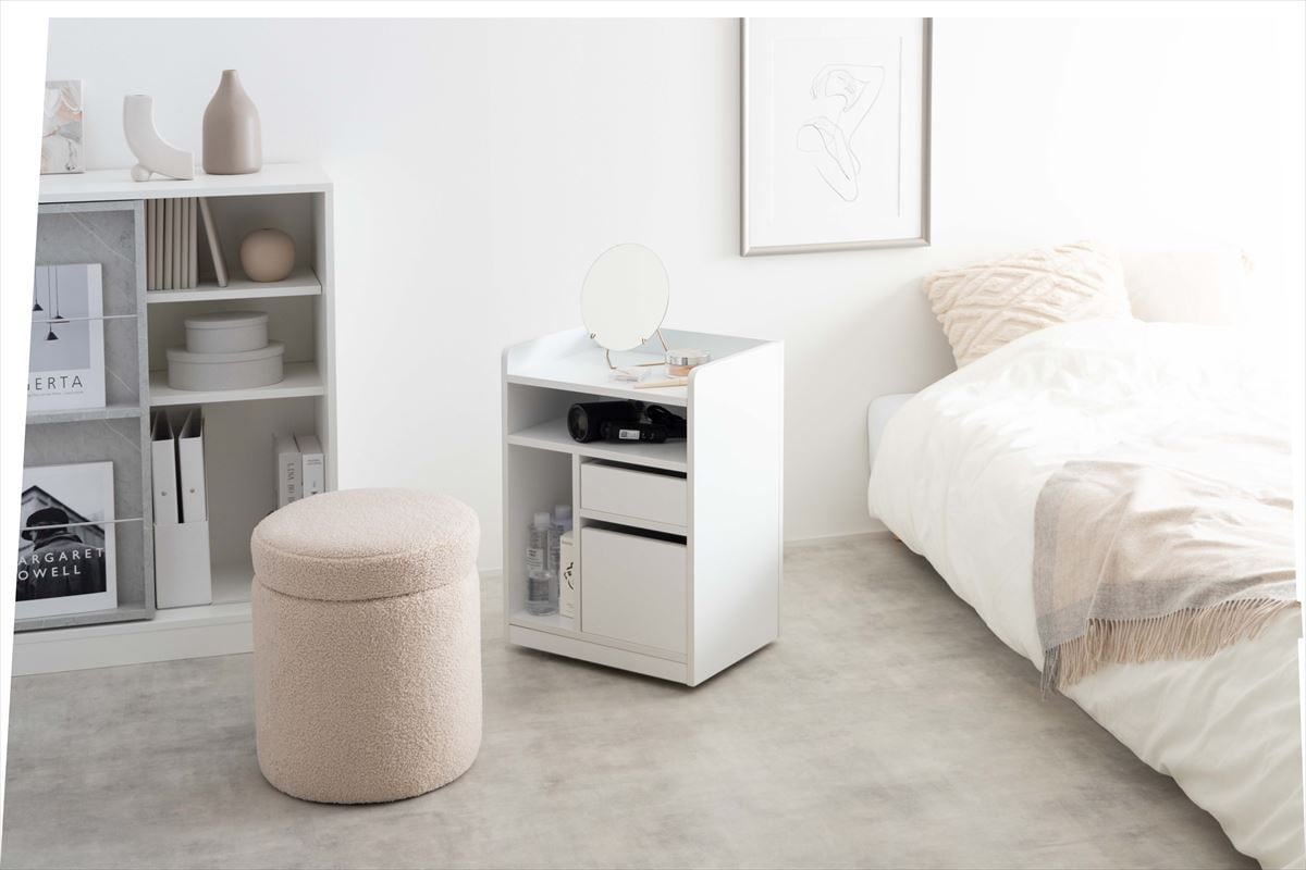 コンパクトなのに収納力も抜群なので、幅広いシーンで大活躍。リビングやベッドサイドで収納として使ったり、デスク下の収納ワゴン、さらにスツールと合わせてドレッサーとしてもお使いいただけます。