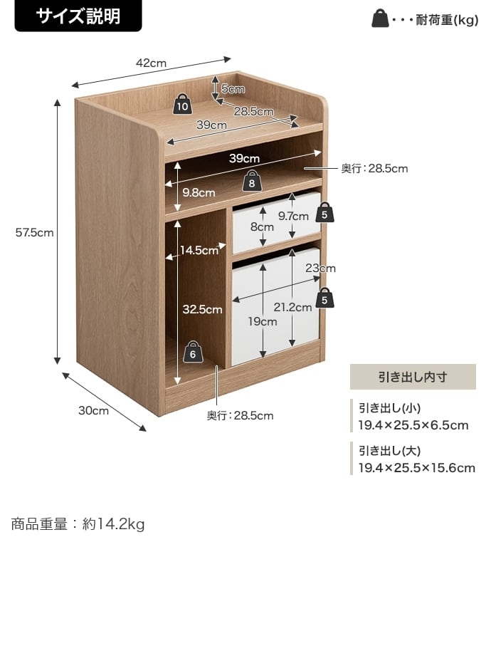 【耐荷重】天板:約10kg、オープン収納:約8kg、ブックラック:約6kg、引き出し(小):約5kg、引き出し(大):約5kg