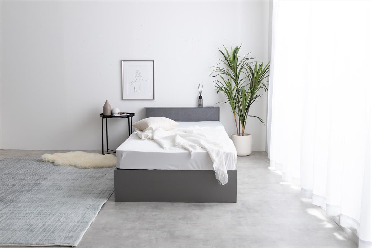 ポイント使いのストーン柄が高級感漂う、宮棚&コンセント付き引き出し収納ベッド。
