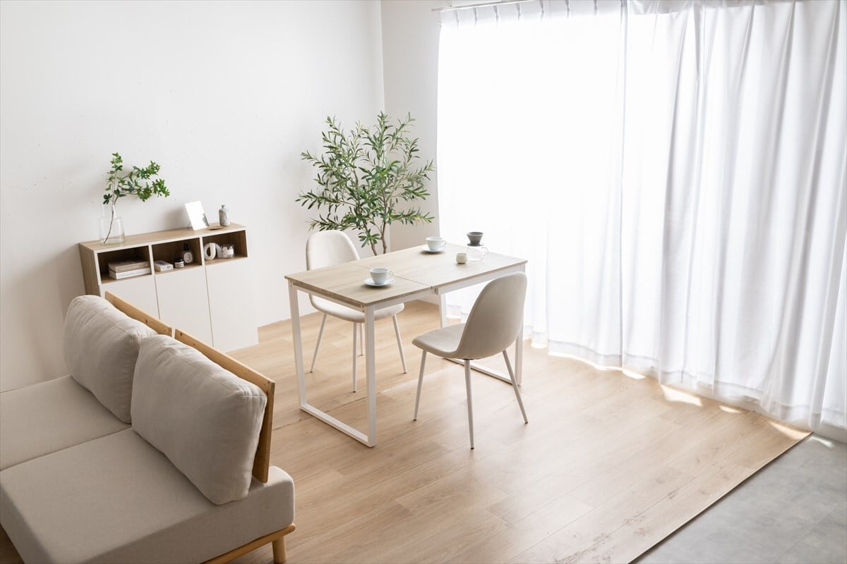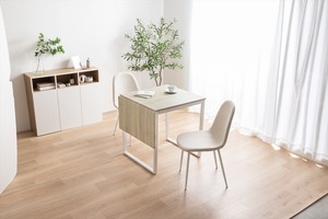 シーンに合わせてテーブルの天板を伸縮できるダイニングセット。お部屋を広く使いたい時はコンパクトに、来客時やゆったりと食事をしたい時にはワイドに広げるなど、好きな時に天板サイズを調整できます。また、コンパクトなサイズなので、一人暮らしでも省スペースで置くことが可能です。
