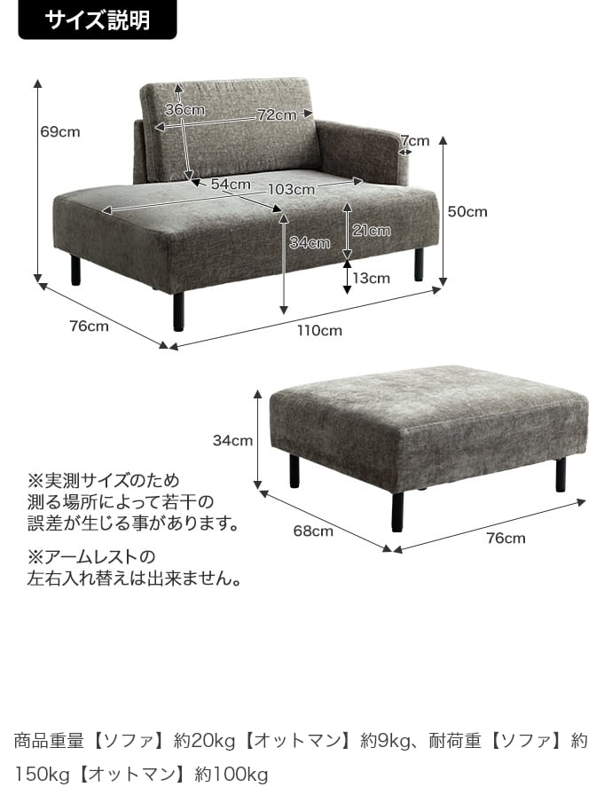 【商品重量】ソファ:約20kg、オットマン:約9kg