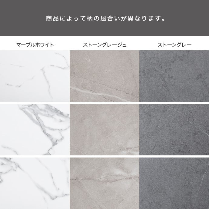 まるで本物の木のようなリアルな風合いの木目調、清潔感と上品さ漂う無地のホワイト、高級感を感じる大理石調、上品で柔らかい印象のストーン柄をご用意しました。