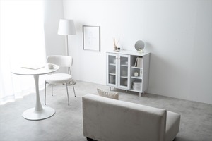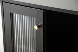 コンパクトながら機能性と美しさを兼ね備えた引き戸キャビネット。モノトーンの本体×ゴールドの取っ手の組み合わせが、海外インテリアを思わせる優雅で上質なデザイン。引き戸のスリットガラス窓が程よく収納物を隠すため、生活感を抑えた、抜け感のある軽やかな空間を演出します。