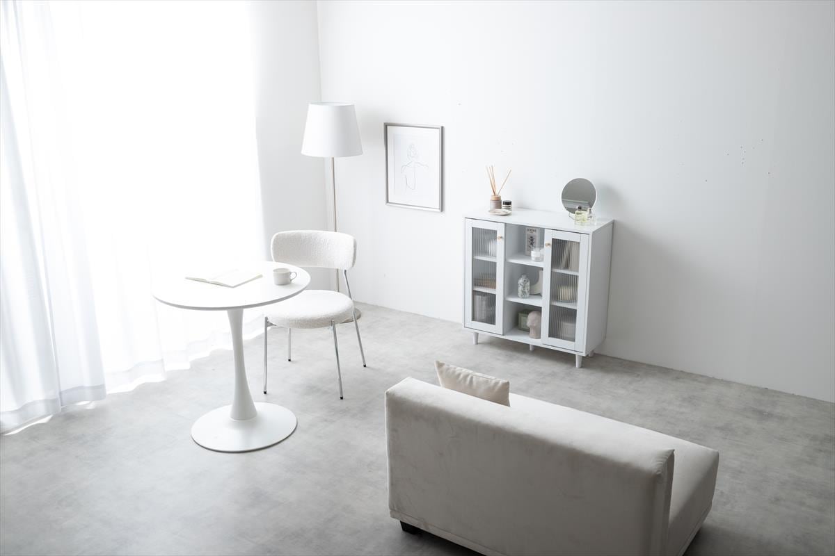 引き戸のモールガラスは光の反射が涼しげで美しく、高級感漂うデザインです。ガラスがキャビネット内をぼかし、生活感を抑え軽やかな印象に。収納物をおしゃれに隠し、程よい透け感が空間全体に上質な雰囲気を与えます。