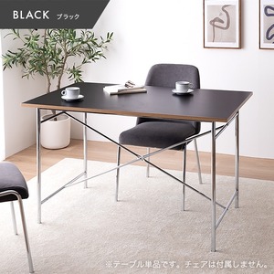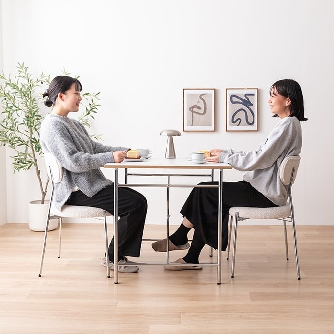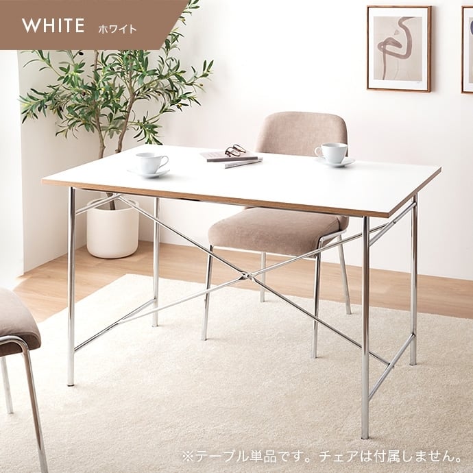 単色×木目×スチールの異素材ミックスが美しいダイニングテーブル。使いやすいサイズ感で、食事だけでなく、ワークスペースや趣味の時間にも大活躍。天板はメラミン加工、脚部にはクロムメッキ加工を施しており、傷や汚れに強くお手入れも簡単です。