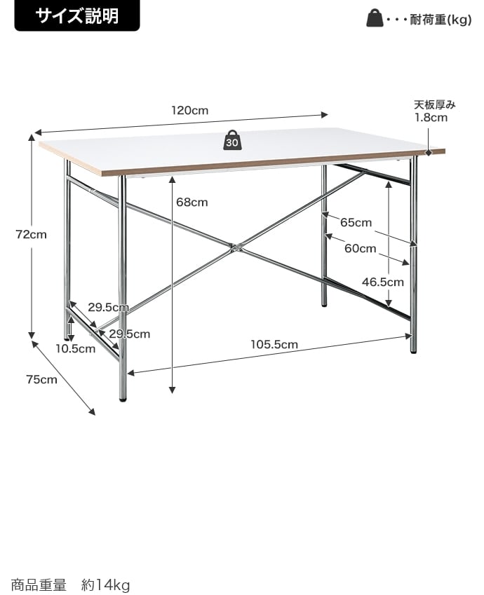 天板は幅120cm×奥行75cmとしっかり広く使えるサイズ感。2~4人で食卓を囲むことができ、作業をしたりする時にも便利な広さです。