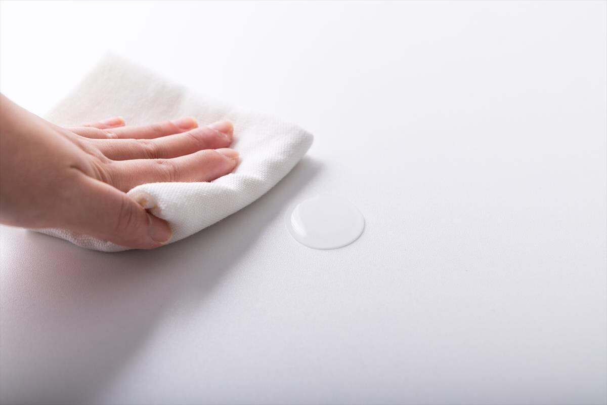 天板には、水や傷に強いメラミン貼りを施しました。汚れが染み込みにくく、ちょっとした衝撃では傷付きにくいため、普段から気兼ねなくお使いいただけます。また、お手入れもサッと拭くだけで簡単にでき便利です。